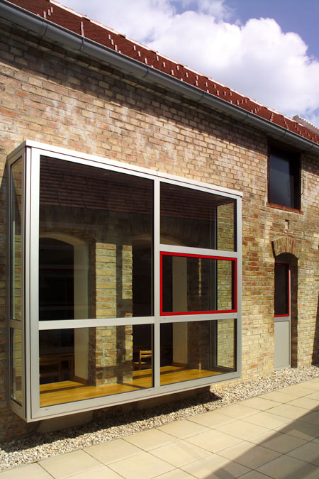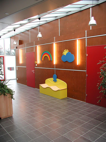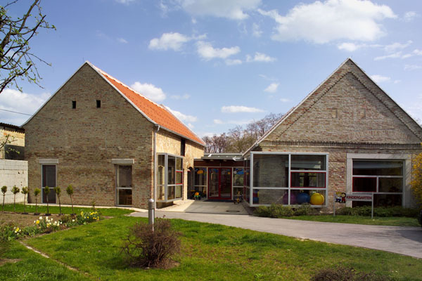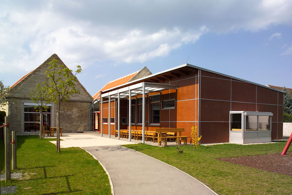 Als Bindeglied zwischen dem Neubau und den beiden Scheunen dient eine neutrale Stahl-Glaskonstruktion. Der Kindergarten ist so konzipiert, dass er jederzeit um eine zweite Gruppe erweitert werden kann. Der Freiraum des Kindergartens bietet unterschiedlich ausgestaltete Funktionsbereiche. Ein leicht geschwungener Erschließungsweg erstreckt sich über den ganzen Freibereich, an dem die unterschiedlichen Spielbereiche angeordnet sind. Der Kindergarten wurde 2013 um einen weiteren Gruppenraum samt Nebenräumen erweitert, ohne dass dadurch der Betrieb des Kindergartens beeinträchtigt wurde. ![]() ![]() |